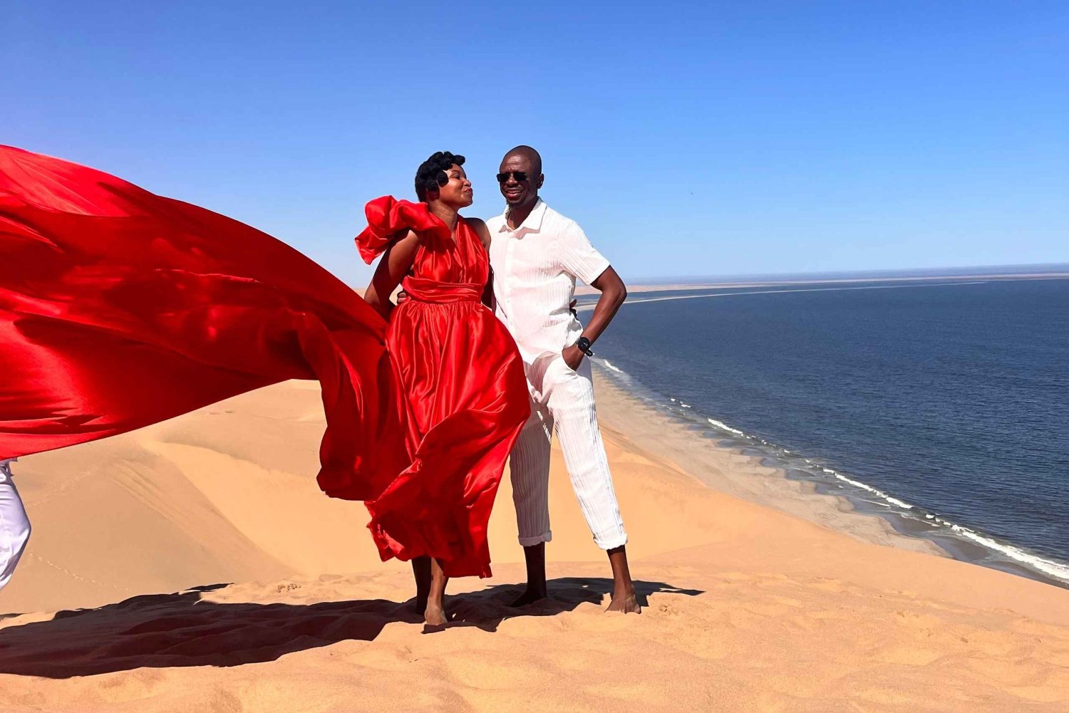 Capture the magic of a flying dress photoshoot in Swakopmund, Namibia. Choose from a variety of stunning dress colors and create timeless memories against dramatic backdrops.