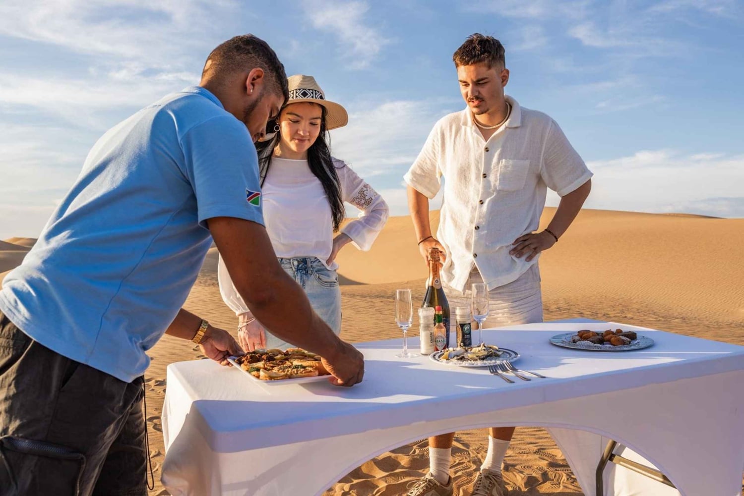 Finally enjoy a light lunch including a selection of fresh Namibian oysters paired with crisp sparkling wine, a selection of savoury and sweet snacks, served with cooldrinks, bottled mineral water and ice-cold Namibian beer on top of a dune or on the beach overlooking the ocean.